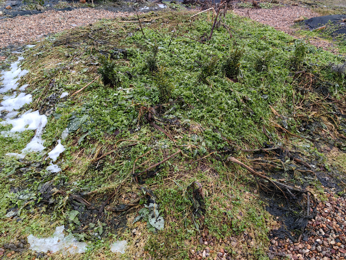 Это у меня за домом в будущем гравийном саду такая буйная зелень))) Самшитики на рассадной клумбе зеленеют. И вот что это за интересный сорняк я так и не поняла. Очень похож на мокрицу, но мне казалось она от мороза погибает, а эта даже тургор не потеряла. На ощупь совершенно живая.