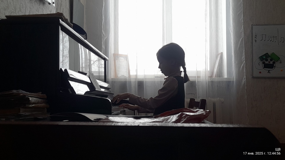 Какой день Любаня пытается эту мелодию на фортепиано освоить. Видимо пошел какой то очередной уровень. Более сложный. Я пару дней послушала, чего она там брякает. Пошла, села рядом. Мы даже вдвоем с ней никак. Не, я не играю))) Я слушаю, наставляю, слежу,в общем.
