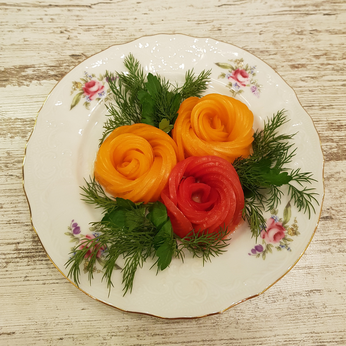 Добрый вечер, дорогие друзья! Сегодня вечером я хочу поделиться с вами одним из способов украшения праздничных блюд, выполняя просьбу моей читательницы Ирины! Для украшения из 3 роз нам понадобятся: 1,5 помидора, зелень укропа и петрушки. Приготовление: разрезать помидор на 2 части, удалить место крепления плодоножки. С противоположного конца от плодоножки отрезать тонкий кусочек, он нам не понадобится. Нарезать острым ножом половинку помидора поперек ломтиками 2 миллиметра толщиной. Последний кусочек нам также не понадобится. Расправить ломтики помидора в длинную дугу. Со стороны, противоположной креплению плодоножки, начать заворачивать помидор. Завернув полностью дугу, мы получаем розочку из помидора. С помощью ножа переносим розочку на тарелку. Подобным способом можно выполнить розы из нектарин, персиков, манго и других фруктов. Главное для выполнения роз — это достаточно мягкие овощи, фрукты и ягоды, острый нож и тонкая нарезка. Хорошего пятничного вечера и красивого празднично