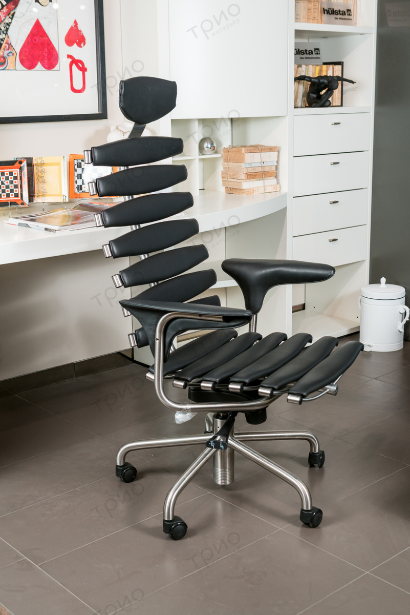 В кресле предусмотрены различные варианты эргономичных подголовников, а металлические ламели обтянуты натуральной кожей. Спинка кресла оснащена системой амортизации, которая обеспечивает оптимальное распределение нагрузки на позвоночник, способствуя поддержанию здоровья спины.