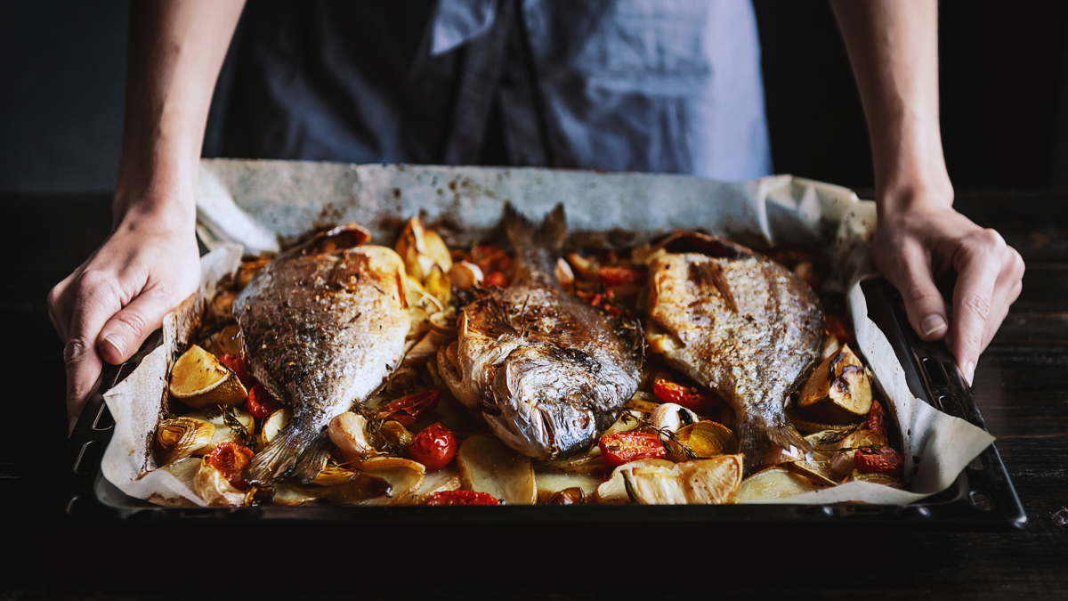 Несколько советов о том, как запечь рыбу, получив в результате вкусное, нежное и сочное блюдо, которое не придётся экстренно «спасать», поливая лимоном или соусом. Увеличьте огонь. Чаще всего рыбу запекают при 180-200 градусах — а вы попробуйте увеличить температуру до 220. Так рыба не только приготовится быстрее: у неё будет более хрустящая корочка и интересный перепад вкусов и текстур из-за реакции Майяра. Поскольку вы запекаете рыбу на кости, она не пересохнет — при условии, что вы вовремя достанете её из духовки. Не надрезайте. Иногда на боках рыбы делают надрезы, чтобы она пропеклась быстрее. Это имеет смысл, если мы жарим рыбу и хотим увеличить площадь хрустящей поверхности, но при запекании только вредит. Через эти надрезы в процессе запекания из рыбы будут выходить соки, и она получится более сухой. Вместо этого дайте рыбе приготовиться «своим ходом» — и тогда в ней останется больше соков. Начините брюшко. В брюшко иногда кладут веточки зелени, дольки лимона и так далее — и
