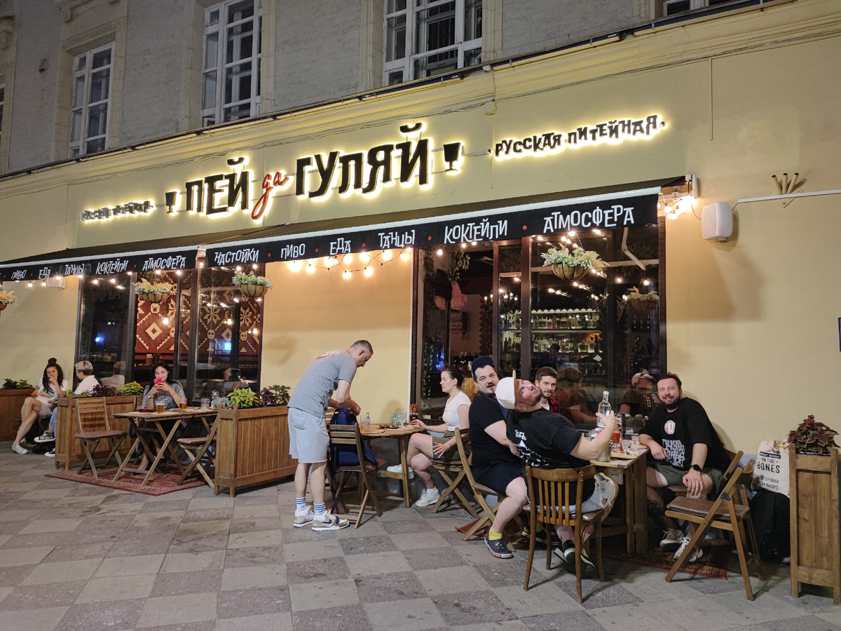 У нас как-то сложилась не то чтобы традиция, но тенденция, после разных презентаций у Самошкина в 4Brewers, завершать вечер в «Пей да гуляй». Не потому, что это какое-то исключительно прекрасное место, а скорее поскольку а) пиво реально быстро надоедает и хочется чего покрепче в продолжение; б) в том районе особо больше в пешей доступности нигде её и не попить с удовольствием. С Костей Шмолдаевым помнится перед его отлётом во Владивосток там красиво откушали водочки, после презентации Чибиса тоже накатили. Это я к тому, чтобы вы не удивлялись, что в фоторяде вперемешку летние картинки с осенними. Внутри два зала: в первом — барная стойка и столики у окон, в дальнем — плотная посадка и кухня. Летом перед фасадом вырастает милая веранда с персональными коврами и живой зеленью. Поскольку позиционируется «Пей да гуляй» как русская питейная, в интерьере присутствует множество культурных отсылок к разному скрепному. Не глубокое и детальное изучение русскости как в «Слёзы берёзы», а сильно п