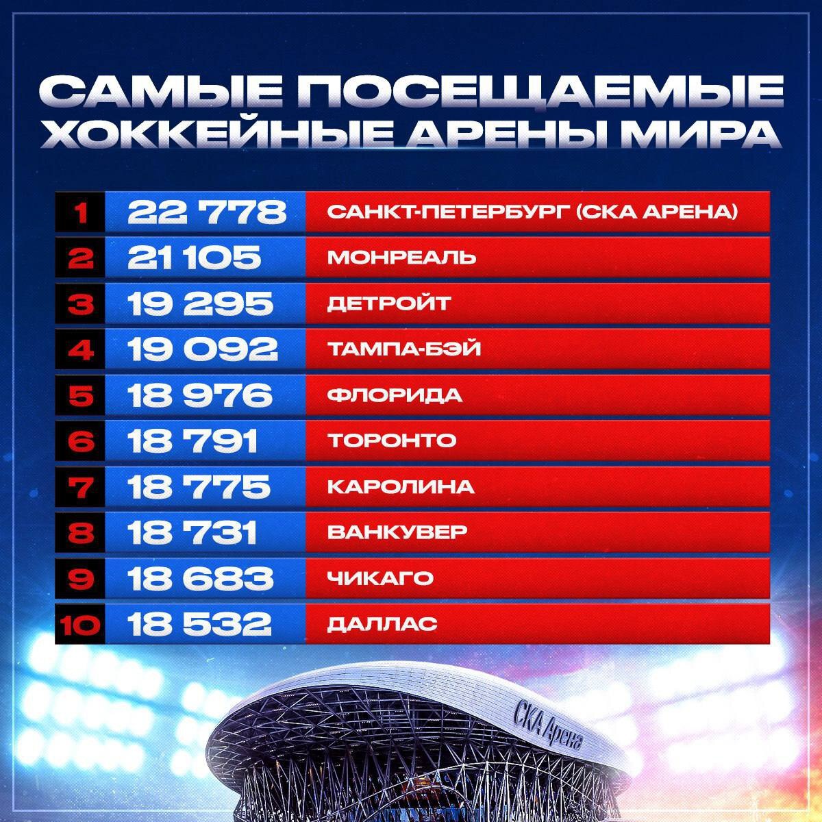 Первое место в рейтинге, опубликованном тренером СКА, занимает «СКА-Арена», второе – арена «Монреаля», третье – «Детройта».