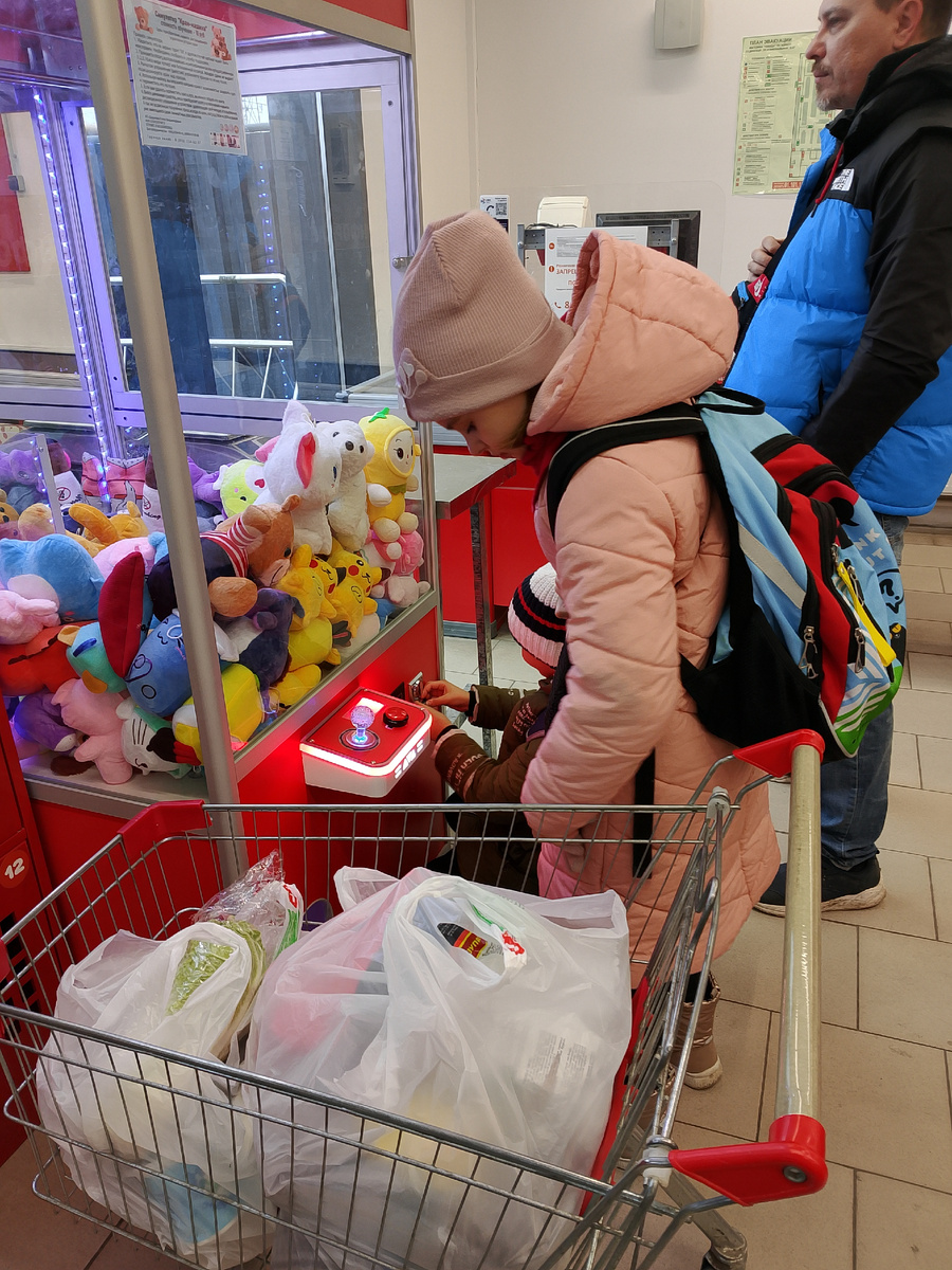 Как же хорошо, что пятница. В 11.30 забрали детей из школы и пошли в магазин за продуктами. Ветер дул холодный, пронизывающий. Все мимо идущие станичники поторапливались, потому что прогулочным шагом при -1 в пасмурный сырой день гулять не хочется. Побыстрее бы оказаться дома. Зашли в магазин. Хорошо, что людей мало, видимо от того, что время обеденное. Самая большая толкучка начинается в пятницу после 16.00. Дети на удивление не просят купить какую-нибудь ерунду, спокойно глазеют на игрушки в автомате и даже не выклянчивают "десярики". Видимо наигрались, а точнее, напроигрывались. Сколько дочкиных слёз было пролито у этого автомата. А сейчас, слава Богу, стоят с братом у груды игрушек и просто рассматривают. Сын никогда не расстраивался из-за того, что не удавалось достать игрушку, а вот Сашуля, каждый раз в слёзы. -Мам, ну давай ещё разок, в этот раз я точно вытащу! Уговоры, объяснения, почти не работали. Снова и снова просьбы и новые попытки. А игрушки всë так же предательс
