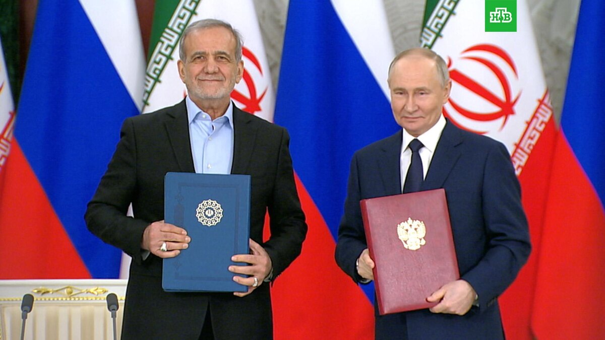 [ Смотреть видео на сайте НТВ ] Президенты России и Ирана по итогам переговоров в Кремле подписали договор о всеобъемлющем стратегическом партнерстве двух стран. Владимир Путин и Масуд Пезешкиан подписали договор о стратегическом партнерстве РФ и Ирана, который заменит Договор об основах взаимоотношений и принципах сотрудничества, заключенный почти четверть века назад. Новый документ призван вывести сотрудничество стран на более высокий уровень. В нем 47 статей, охватывающих оборону, борьбу с терроризмом, энергетику, финансы, транспорт, промышленность, сельское хозяйство, культуру, науку и технологии. Есть также пункт об уважении территориальной целостности обоих государств. Владимир Путин, открывая встречу с Масудом Пезешкианом, подчеркнул, что визит лидера Ирана в Москву имеет особое значение, а договор «придаст дополнительный импульс по всем направлениям». Работа над новым договором велась с 2022 года. И в Москве, и в Тегеране уверены, что документ отражает выход двусторонних связей