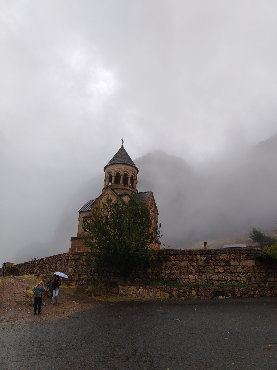 Нораванк является одним из самых красивых монастырских комплексов Армении. Но на меня произвели впечатление не столько монастырь, сколько окружающие его виды. Монастырь является не только одним из самых старых в Армении – ему уже более семи столетий, но и одним из значимых образцов армянской архитектуры, имеющий важное значение в истории христианства Армении. Монастырь расположен в 122 км от Еревана, вблизи села Арени. Находится он прямо в горах, точнее, в ущелье, а еще точнее, на нешироком уступе узкого и извилистого ущелья притока реки Арпа. Когда мы приехали в монастырь, шел дождь. На окружающие горы опустились облака и сам монастырь, окутанный дымкой, выглядел летящим в облаках. Монастырь Нораванк построен в 1205 году. В XIII—XIV веках в нем располагалась резиденция епископа Сюника и был он крупным духовным и культурным центром Армении. Территория окружена толстыми стенами, внутри которых расположены три церкви, две часовни, административные здания. Церковь Святой Богородицы В цен