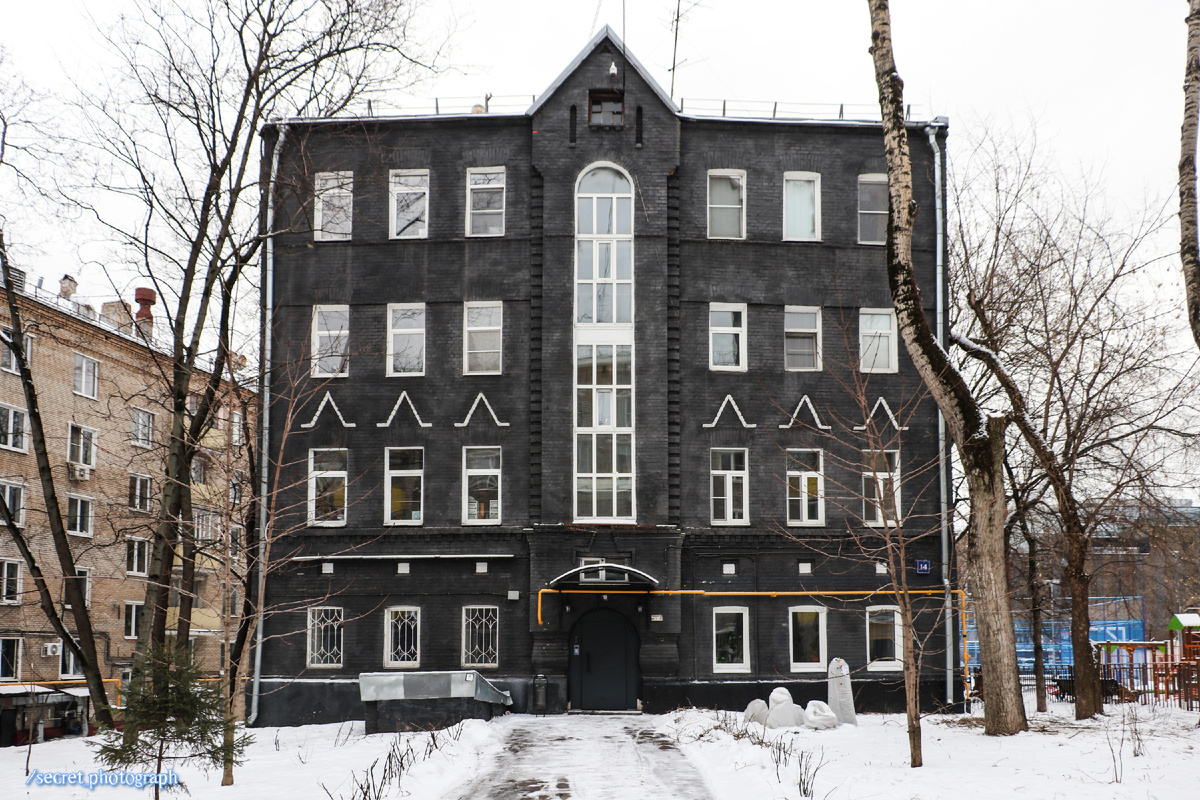 В черном-черном городе на черной-черной улице стоит черный… простите, увлекся. Но эту небольшую заметку и правда хочется сделать не совсем обычной. Хотя бы потому, что не совсем обычна история, которую я решил сегодня рассказать. Когда в нашем маленьком, но уютном телеграмм-чате зашла речь о том, что я планирую написать о доме Анны Монс (что и было проделано мною вчера), кто-то из дорогих участников беседы поведал мне о необычном здании, что стоит совсем рядом с палатами врачей ван дер Гульстов – там же, в Старокирочном переулке. И конечно, я уже не мог обойти это своим вниманием. Впрочем, обо всем по порядку. Обязательно дочитайте статью. До конца! Четырехэтажное строение с маленьким треугольным фронтоном и высоким, на три этажа, арочным окном по центру, эклектично соединяя в себе неоклассицизм, кирпичный стиль и совсем немного неоготики… Об истории этого дома написано и сказано очень мало. По сути, известно лишь то, что он был построен в 1910 году, а его заказчицей и владелицей с мом