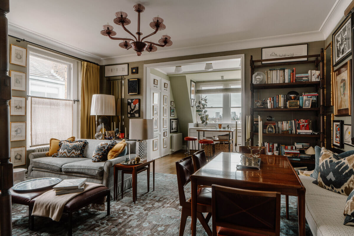 Верхний этаж викторианского особняка в Лондоне полностью переосмыслен ведущим дизайнером интерьера Мартином Брудницки. Двухкомнатная квартира с открытой планировкой гостиной оформлена в уютном стиле, наполненном историческими деталями и искусством. Вся квартира площадью 80 квадратных метров кажется теплой и гостеприимной благодаря целостной цветовой палитре спокойных, приглушенных тонов, многослойному текстилю, высококачественным материалам и произведениям искусства. А благодаря расположению на верхнем этаже квартира светлая и может похвастаться прекрасными видами. Открытая планировка жилого пространства представляет собой великолепную комнату с окнами на две стороны. Стены украшены обоями с зелеными морскими водорослями от Altfield в паре с охристо-желтыми шерстяными саржевыми шторами от Fox Linton. Зона отдыха сосредоточена вокруг двух окон. Удобный диван с подушками в охристо-желтых и синих тонах сочетается с двумя яркими красными креслами. Стены в квартире украшены произведениями и