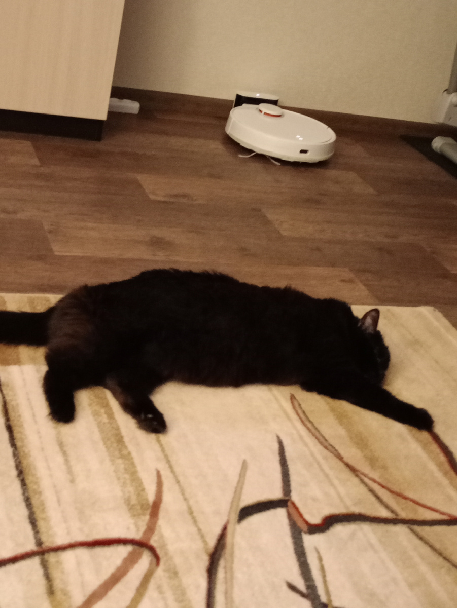 Ох, зря я купила светлый ковёр в дом, где живёт чёрный кот! И почему коты спят целыми днями?.. Потому что ночью заняты важным делом. Они наводят дома уют - раскидывают повсюду шерсть и втирают её для большего эффекта лапками, спинами и остальными частями тела. Вот и Тимофей попался мне на глаза, когда в 1 ночи старательно трудился над дизайном ковра. Есть у меня такая особенность - если проснусь в момент засыпания, то потом часа два брожу, как неприкаянная. Тогда ухожу в зал и читаю или смотрю кино. Как-то задумалась - почему на следующий день после уборки ковёр выглядит так, словно его пылесосили пару недель назад? Где мой просчёт? А тут в ночной тишине заходит Тимофей в зал, падает на бок прямо посреди моего чистого ковра и начинает извиваться! Уж как он тёрся... словно я весь ковёр валерьянкой опрыскала. И с боку и на бок перекатывался, и шею свою мощную вытирал, и хвост без дела не оставался, и старался вытянуться на всю длинну ковра, а лапки растопыривал и так, словно невзна