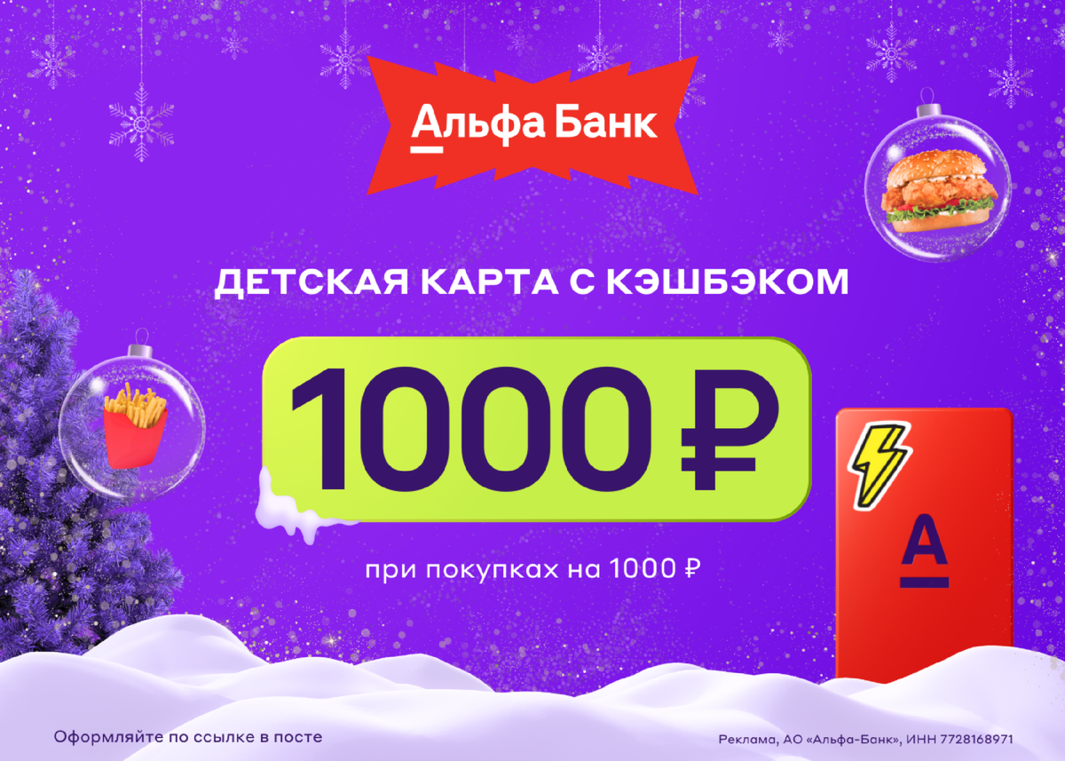 Детская карта, как у взрослого! Карта Альфа-Банка для детей с 6 до 14 лет! Бесплатная навсегда и без условий. - Приложение с финансовыми подсказками и призами. - Расходы под контролем: видно, на что ребенок тратит деньги. - Кэшбэк 5% в категориях на выбор ➕ 1% на всё. 🎁 За оформление бонус – кэшбэк 1000 ₽ при покупках на сумму от 1000 ₽. Гораздо удобнее, чем наличные: безопаснее, можно быстро перевести деньги ребенку в любой момент и смотреть историю покупок. Плюс возможность научить ребенка управлять деньгами: копить, планировать расходы, грамотно управлять своим бюджетом. 😍 Яркие стикеры в комплекте, чтобы украсить карту, как захочется! Оформляйте ее по ссылке https://kids1251.prfl.me/6238cc608d70de4bf05c082d/byqf26?erid=2Vtzqw3cvTM