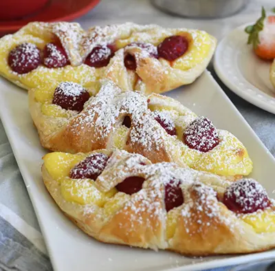 Восхитительно элегантные и невероятно вкусные, эти пирожные наполнены насыщенным заварным кремом и сладкой малиной и покрыты слоёным тестом. Этот рецепт очень прост, и на его приготовление от начала до конца уйдёт меньше часа. Обязательно попробуйте приготвить. Вот рецепт слоеных пирожных с малиной. Для приготовления нужны вот эти продукты: 1 большой прямоугольный лист слоёного теста (375 г) четыре больших яичных желтка 100 г сахара 50 г кукурузного крахмала 475 мл горячего молока 1 чайная ложка ванильного экстракта 170 г малины 1 яичный белок или 2 столовые ложки молока для смазывания сахарная пудра для посыпки. Время приготовления: 45 минут. Все нужные продукты собраны. Начинаем готовить вкусные слоеные пирожные с малиной. 1. Приготовьте заварной крем. В кастрюле среднего размера взбейте яичные желтки с сахаром и кукурузным крахмалом до получения лёгкой и пышной массы. Добавьте примерно 1/4 стакана горячего молока и взбейте до получения однородной массы. Постепенно добавляйте оставше