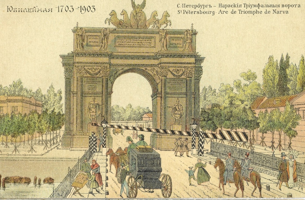 Нарвские триумфальные ворота появляются в 1834 году на современной площади Стачек у юго-западного въезда в Петербург в память о победоносном возвращении наших войск после победы над Наполеоном. Здесь же долгое время находилась городская застава, что отражено на одной из первых открыток с видом ворот, выпущенной к 200-летию Петербурга.