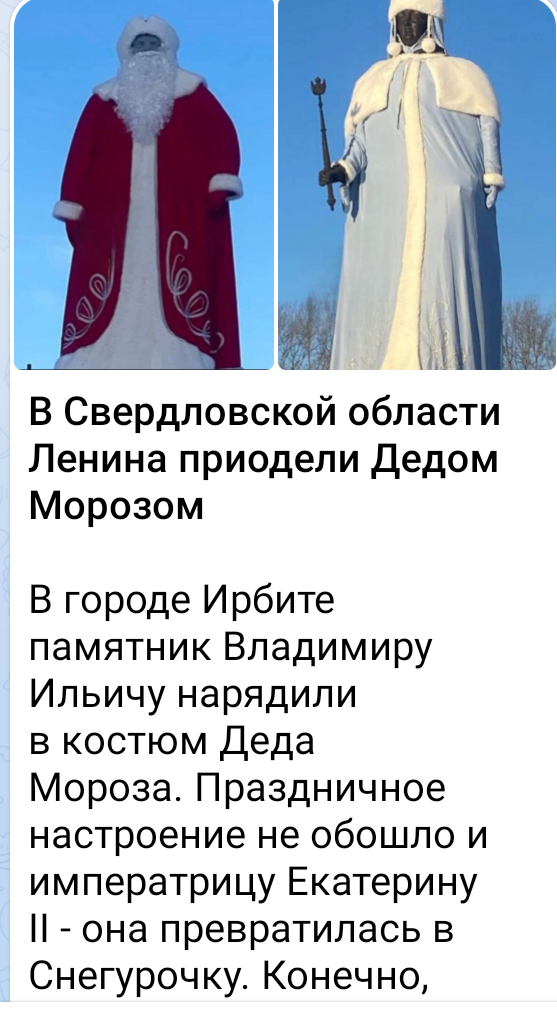 Большая страна у нас, всю не облетишь.. Народ возмутился. Но потом успокоился. Их раздели достаточно быстро. А фото на века! Очень милый симпатяга 🎄🔥 Тут выплыла одна история. Всё-таки люди у нас имеют вкус и претендуют на изысканность. Герой события - местный чиновник. Крик отчаяния! А не фиг заигрывать с кассиршами! Ни один Голливуд не пострадал)) А на одного счастливого человека стало больше. И новости в газете о нём тоже пиар. Одни тут переполошили МЧС. Наверняка не только водичку там пили Ну и слава скульптору! Вот такие истории, мои зайчатки Обнимаю и лапкопожимаю всех!