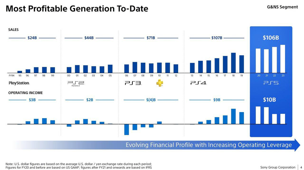 PlayStation 5 установила новый рекорд доходности для компании Sony, принеся $10 миллиардов операционной прибыли всего за четыре года с момента своего релиза. На графике видно, что PS5 опережает PS4, которая принесла Sony $9 миллиардов за свой цикл, и значительно превосходит PS3, ставшую самым убыточным поколением, с потерями в $4 миллиарда (затраты на PS3 окупились лишь к концу её жизненного цикла).