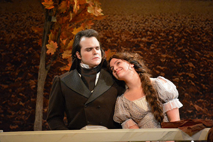 Открывается занавес, и чисто внешне – вроде бы все то: Татьяна и Ольга музицируют у открытого окна, Ларина и няня дремлют под их рулады на ступеньках барского дома, на всех героях – костюмы 30-х годов позапрошлого века, то есть в точном соответствии с Пушкиным – Чайковским – Станиславским (замечательная работа Ники Вылегжаниновой), золотая осень напоминает о себе свисающей с колосников роскошной веткой и парчовым задником. Но это, конечно, обманка, и Бертман не был бы Бертманом, если бы не сказал своего слова в «реконструкции». Рисунки ролей героев – все новые, они имеют мало общего с нашими представлениями о классической (пусть не Станиславского, любой классической) интерпретации. Поведение персонажей полно «ужимок», мало соответствующих нравам хоть и провинциальных, но все же дворян: чего стоят бесконечно кривляющиеся сестры Ларины, передергивающая плечиками, пританцовывающая помещица и постоянно издевательски улыбающийся Онегин! Утрирование комических элементов даже там, где они вовсе не предусмотрены авторами оперы, заполонило собой первые пять картин спектакля. В трагической сцене дуэли тоже есть свой клоун: эта функция отдана мимическому мсье Гийо, секунданту титульного героя… Тем самым ярко проявила себя так любимая в «Геликоне» эстетика капустника, выраженная тяга к гэгам и «приколам», поэтому наиболее гармоничный эпизод постановки – это явление мсье Трике на ларинском бау. Здесь было «все на месте», всего в пору. Лирико-романтический же дух в очередной раз изгнали, заменив безудержным оригинальничаньем: пьяных крестьян или Гремина в инвалидной коляске, как в прошлой геликоновской версии, все-таки не было, но и пушкинского в этом спектакле не оказалось ничего, несмотря на «аутентичную» сценографию (художник Вячеслав Окунев).