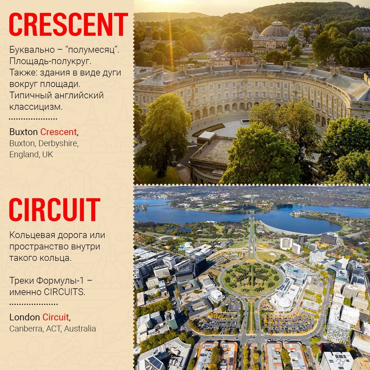SQUARE = вроде как “сквер”. Или площадь. Или квадрат. С площадями в английском всё не так просто... С русской “площадью” понятно: Она либо родственна слову “плоский”, либо идёт от др.-греч. πλατύς, PLATIS – “широкий”. По сути, площадь – большая плоскость. В английском не так. Например, TRAFALGAR SQUARE в Лондоне не очень-то плоская: фонтаны, скульптуры и перепады высоты. Почему? ·················· 1. А потому, что английская площадь – SQUARE – уже чисто по определению не “плоская”: Она – “упорядоченная” и, по идее, “квадратная”. От лат. EXQUADRA: ex+quadare – привести в порядок; сделать квадрат. Но не квадратом единым… Для площадей разной формы есть разные названия соответственно: • CRESCENT – площадь в виде полукруга, буквально “полумесяц”. • CIRCUS – площадь или комплекс зданий в виде круга, от лат. “круг”. Другое значение слова – цирк, круглая римская арена. Кстати, от латинского CIRCUS идёт и русское “цирк”. • CIRCLE – тоже круглая площадь, дорога или сам комплекс зданий. Тоже