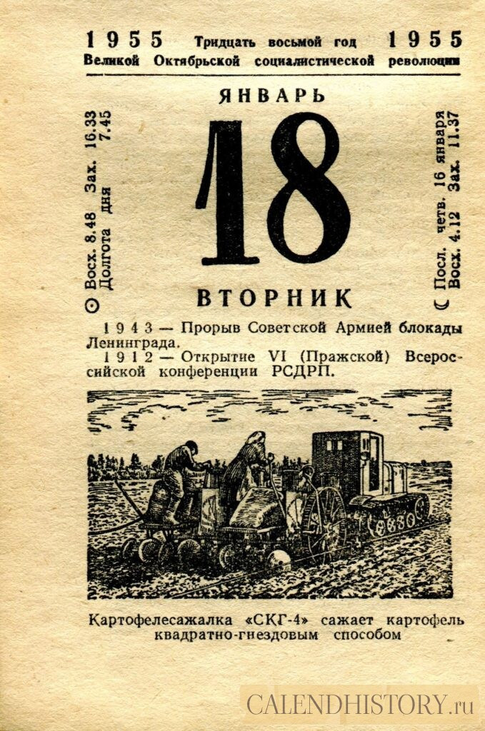 Итак, сегодня 18-го января и у нас на календаре 1955-й год. Перед нами листок советского календаря Политиздата. На календаре у нас вторник - 18 января 1955-го года. Картофелесажалка «СКГ-4» сажает картофель квадратно-гнездовым способом 1943 — Прорыв Советской Армией блокады Ленинграда.