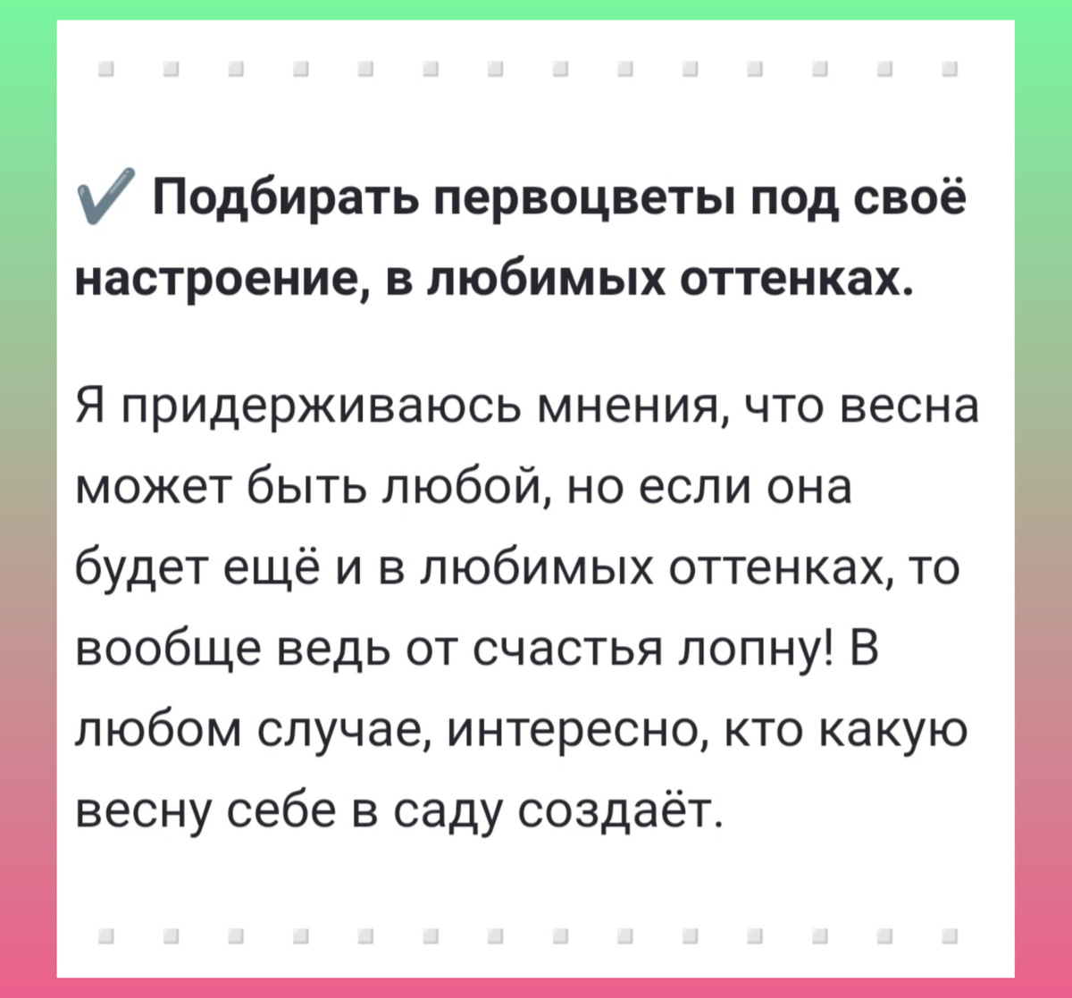 Среди лучших советов читателей, которые я отбирала из ваших комментариев на канале, есть один, на первый взгляд, не особо важный. Я сделала скрин ⬇️ Вся статья с советами здесь ⬇️ Но я бы хотела выделить этот совет в свете сегодняшней публикации, поскольку у меня есть личная история, что цвет может сделать для человека. Вообще, вы же замечали, что в разные периоды жизни нас тянет к определённому цвету? Моя сестра с детства "тряпишница" (любит одежду и часто её покупает), по её гардеробу можно легко определить, к какому цвету её тянет в данный момент. Открываешь шкаф, а там всё розовое! Розовый период. Вы, возможно, не один год предпочитая сажать растения какого-то одного цвета соцветий, в один момент всё меняете, поскольку вдруг потянянуло посадить что-то другого цвета. При этом всё, что касается психологии цвета, всегда выглядит довольно не научно, будто гороскоп читаешь, описание знаков зодиака: вроде всё правильно, но слова настолько общие, что может подойти к кому и чему уг