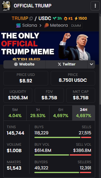 Всем привет, сегодняшнее утро обещает быть насыщенным, ведь Трамп выпустил свой официальный токен буквально несколько часов назад, и с того момента его капитализация составляет 8,5 миллиардов долларов США, а на текущий момент его стоимость оценивается в 8,92$ за 1 $TRUMP и цена продолжает стабильно расти. На теущий момент есть счастливчики, которые смогли заработать на данном росте несколько миллионов долларов. По мнению автора, рост может продолжиться вплоть до 20 Января 2024 года, т.к. именно в этот день Трамп официально заступит на должность президента. После чего, скорее всего, токен испытает коррекцию. Присоединяйся в наш телеграмм канал, там много всего интересного!