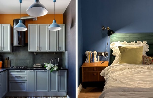 Главная фишка проекта — насыщенные глубокие оттенки в отделке: синий, зеленый, оранжевый. А в детской стены оклеены интересными обоями с забавным принтом. Чтобы сохранить исторический дух того времени, в комнатах отреставрировали старый паркет и наполнили интерьер винтажными вещами, постерами и искусством — они делают обстановку уникальной.
