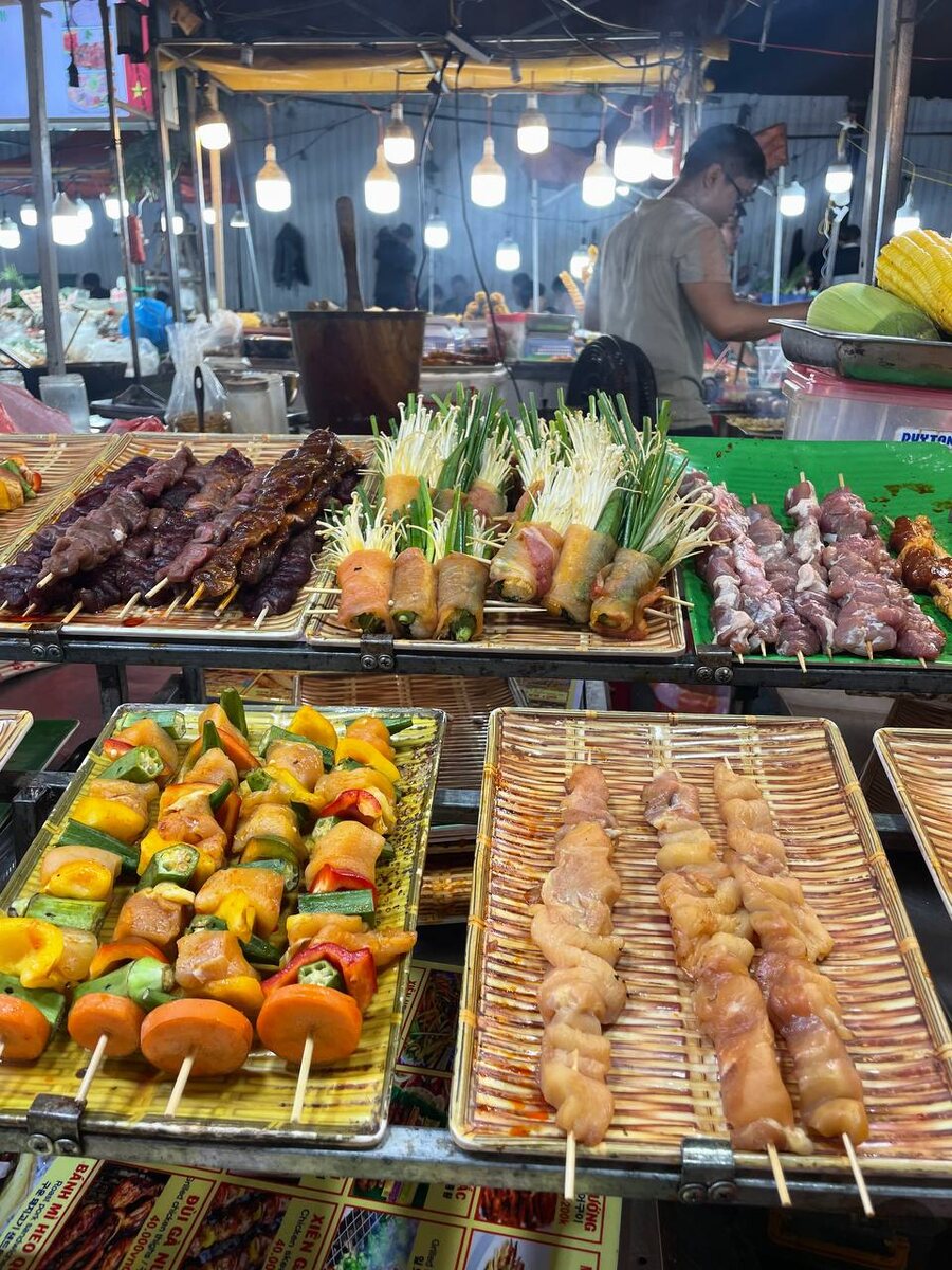 Ночные рынки Вьетнама оживают после заката, когда температура на улице становится более приятной. Здесь можно найти всё: от свежих фруктов и овощей до ручной работы и текстиля. Но сегодня я расскажу о том, какую еду готовят на этих рынках и что можно попробовать. Лучшее время для посещения — с наступлением темноты, когда еда только готовится, и можно попробовать самые свежие блюда. Не стесняйтесь торговаться — это часть местной культуры. И, конечно, будьте готовы к толпам: на вьетнамских ночных рынках всегда многолюдно. Мы недавно посетили ночной рынок Son Tra в Дананге, который известен своим огромным ассортиментом уличной еды. Честно говоря, еда здесь казалась не слишком аппетитной, особенно если сравнивать с изобилием морепродуктов и сладостей на тайских рынках. Но были все основные национальные блюда Вьетнама, которые стоит попробовать. Также я увидела очень много странной для меня еды. Разные шашлычки из мяса и чего-то непонятного, даже лягушки на гриле. Чтобы не растеряться при п