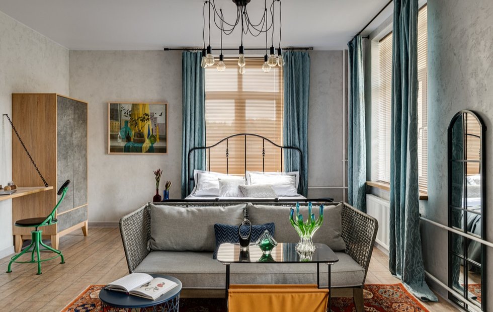 Отказались от внутренних перегородок и объединили кухню, гостиную и спальню. Для стен выбрали штукатурку, а в прихожей использовали коряги и гимнастический снаряд Место: Красногорск Метраж: 36 кв. м Комнаты: 1 Дизайн: Элина Богомолова Стилист: Настасья Корбут Фото: Роман Мокров Это квартира-студия под сдачу. Перед дизайнером Элиной Богомоловой заказчик поставил цель — создать универсальное пространство, выгодно выделяющееся на общем фоне арендного жилья. В итоге интерьер квартиры решили в лофтовом стиле: штукатурка на стенах — отсылка к необработанному бетону, пол имеет рустикальный рисунок, в отделке есть индустриальные детали типа веревки, цепей, металла. Планировка тоже соответствует — в помещении нет перегородок. По плану застройщика в квартире были стандартная изолированная компактная кухня, длинный темный коридор и комната, а также раздельный маленький санузел. Перегородку между кухней, комнатой и коридором решили не возводить. За счет этого получили большое светлое пространство.