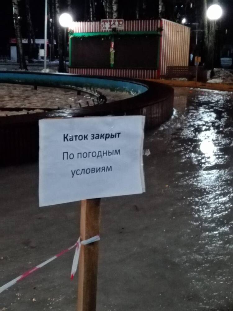 Мэрия Ярославля опубликовала фото таблички, установленной на катке, с надписью «Каток закрыт по погодным условиям». На заднем фоне видно, что каток буквально тает. Впрочем, это неудивительно: сегодня в Ярославле до плюс 1 градуса тепла.