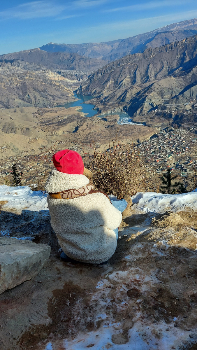 Спала примерно час за всю ночь из-за страшного холода🥶. С утра хозяева уходят на работу, поэтому никакого там выселения до 12. В 9 милости просим за дверь. Хозяйка накрыла разнообразный завтрак. Шакшура из гречки, блины с вареньем из граната, сыры, колбаса. Вкуснооо. Но если выбирать, то лучше отопление и сон. В последствии разговорившись с местным гидом оказалось, что эл-во вырубили не у всех ночью. В общем тут, как повезет. Я бы не советовала испытывать судьбу и планировать ночевку в Гунибе. Но места, которые я хотела бы посмотреть в будущем, по близости к этому городу, поэтому не зарекаюсь. На площади договорилась с таксистом-гидом, что за 400 р. он меня докинет до оборонительных стен, где открывается вид на город, подождет и вернет обратно на площадь. А оттуда в 13 стартует маршрутка за 350 р до Махачкалы. Это единственный способ попасть в Дербент из Гуниба - через Махачкалу... Меня должны были отвезти максимально близко к вершине, но там шел ремонт дороги и мне пришлось идти