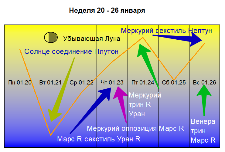 ГОРОСКОП ЗДОРОВЬЯ на НЕДЕЛЮ 20 - 26 ЯНВАРЯ Внимание В прогнозе даются советы и рекомендации связанные только с консервативным лечением. Не с хирургией и тому подобными активными вмешательствами в дела организма. На это и следует ориентироваться в борьбе за здоровье. До 21 января Луна способствует закреплению достигнутых в оздоровлении успехов и накоплению энергии, питательных и лекарственных веществ на будущее. После 21 числа стремитесь, больше внимания обращать на хронические заболевания, отказывайтесь от вредных привычек, следите за скрытыми недугами. До Новолуния 29 января Луна способствует работе по оздоровлению с хроническими заболеваниями, борьбе с вредными привычками, монитроингу скрытых недугов. Не перегружайтесь физически и эмоционально, распределяйте свои силы правильно. 20 и большую часть 21 января Луна в Весах. Можно проще и быстрее активизировать и стабилизировать дыхательную систему. Активен газообмен в основном в средней части тела. Бывайте на свежем воздухе, ограничьте