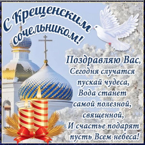 Дорогие друзья, поздравляю вас с праздником! Крещенский сочельник — это день накануне праздника Богоявления, или Крещения Господня. В этот день люди готовились к празднику, соблюдая пост. Поэтому вечер называли голодным: разрешалось есть только сочиво — особое блюдо из зёрен, а также постную кашу, блины с овощами и медовые оладьи. Считалось, что в Крещение снег приобретает особые свойства, поэтому его собирали и использовали в разных целях. Женщины знали, что только крещенский снег может сделать холстину белоснежной. Также верили, что снег, собранный в крещенский сочельник, может излечить болезни, а если искупаться в бане, где использовали воду из такого снега, то можно сохранить красоту на долгое время. В старину появился обычай, который сохранился до наших дней: ходить в полночь на Крещение за водой на реку. Принеся воду домой, её хранили: считалось, что она может стоять в закрытой посуде, не портясь, и обладает такими же чудесными свойствами, как и крещенский снег. Одна из традиц