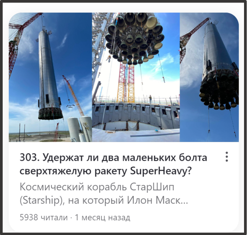 Леонид Коновалов утверждает, что возвращение первой ступени супертяжа Старшип (полеты 5 и 7) было создано на компьютере. Он, как профессиональный кинооператор, это сразу увидел. Так он утверждает. У него глаз-алмаз. Или глаз-экспонометр. Этой теории компьютерного возвращения бустера Старшипа Леонид посвятил несколько публикаций. ... И тем самым поставил на кон свою репутацию: "На наш взгляд, удачный возврат и захват с помощью рычагов Мегазиллы летящей ступени был осуществлён с помощью компьютерной графики, поскольку в жизни он был реально не выполнимым" "1-я ступень ожидаемо села на свои два болта на вышке, успешно, поскольку это была компьютерная графика - сам возврат." Погорячился Коновалов. Репутацию среди своих поклонников он завоевывал годами. А теперь опрометчивые публикации могут поставить крест на всей карьере оператора-экстрасенса. Репутация сразу стала опасно качаться. Почему? А потому что стартовая площадка на Бока Чика прекрасно видна с огромного расстояния. Даже из Мексик