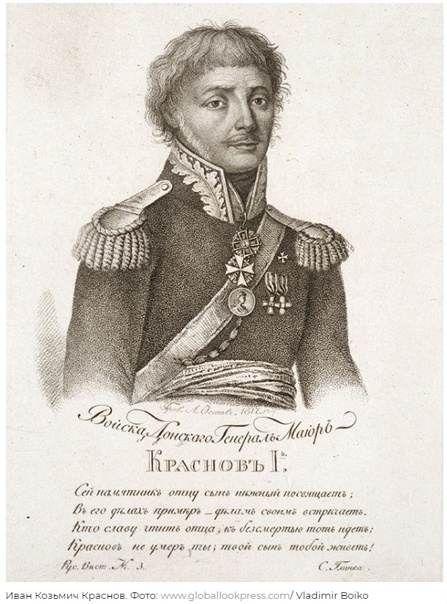 Иван Козьмич Краснов 1-й (1752 (по другим данным – 1753) – 25 августа 1812), генерал-майор (1799) происходил из казачьих детей Войска Донского (родился в станице Букановской). На службу записан казаком в 1773 г., в следующем году был назначен полковым писарем. В 1781 г. стал сотником, в 1783 г. назначен полковым есаулом, а в 1785 г. получил армейский чин поручика. Отличился 1 октября 1787 г. на Кинбурнской косе: будучи ординарцем у А.В. Суворова, при выполнении его распоряжений был ранен в «сильнейшем огне» пулей в правую ногу (произведен в капитаны), участвовал во взятии Очакова и Бендер (легко ранен в левую ногу и получил чин секунд-майора). При осаде Измаиле «употреблен был от главнокомандующего в ночное время для измерения крепостного рва, что и выполнил с точным успехом», а во время штурма захватил три орудия (произведен в премьер-майоры). В Мачинском сражении 25 июля 1791 г. отнял у турок два знамени (получил похвальную грамоту от Екатерины II и золотую медаль для ношения на г