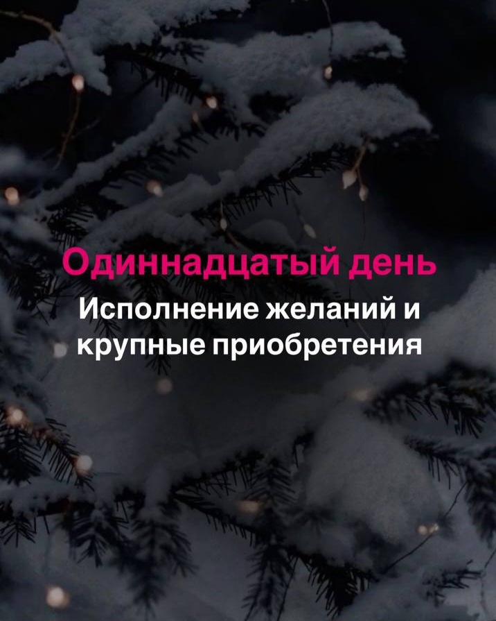 11 из 12 магических дней Ритуал на исполнение желаний. Материалы и инвентарь: – белая свеча, – спички, – красная хлопковая или шерстяная нить, – список желаний на год, – перечень планируемых крупных приобретений. Усилители: (применяются по желанию): – эфирные масла шалфея или сандала по 1 капле. Порядок действий: 1. Зажгите свечу. 2. Возьмите красную нить. 3. Положите перед собой список желаний. 4. Прочитайте первое желание вслух, завязывая первый узел, после скажите – «да будет так». 5. Сделайте столько узелков, сколько у вас пунктов в списке. 6. Возьмите перечень планируемых приобретений. 7. Затяните узел, проговаривая вслух «в этом году я куплю...», потом «да будет так». 8. Повторите все аналогично п. 5. 9. Смажьте веревочку с узлами эфирным маслом (при их наличии). 10. Положите получившуюся "лестницу" в сундучок. Туда же поместите план покупок и список желаний. 11. В этот раз желательно НЕ ГАСИТЬ свечу, а дождаться когда она догорит. 12. Поблагодарите силы и энергии, участв