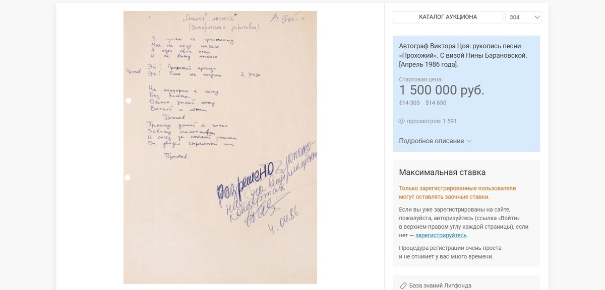 Рукопись песни «Прохожий», написанная лидером группы «Кино» Виктором Цоем, выставлена на торги за 1,5 млн руб. Об этом сообщает пресс-служба аукционного дома «Литфонд». Песня была написана в 1986 году и имела другое название — «Сильная личность», в 1988 году она вошла в альбом «Группа крови». Под текстом стоит виза методиста Ленинградского межсоюзного дома самодеятельно творчества Нины Барановской: «Разрешено исполнение на внутриклубных концертах». Именно она подтверждала разрешение исполнять песню на концертах в Ленинградском рок-клубе. Ранее письмо Альберта Эйнштейна о ядерной программе нацисткой Германии продали почти за 4 млн долларов Кирилл Суржик