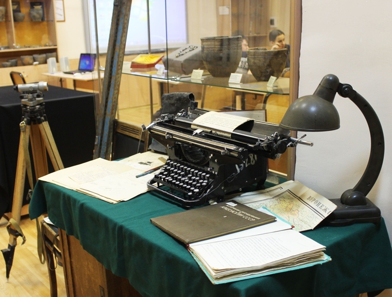 Среди предметов на рабочем столе внимание привлекает печатная машинка. На ней работали в послевоенное время. Это - инструмент для «расшифровки» полевых записей со страниц блокнотов. Сейчас способы работы с информацией несколько усовершенствовались, но современные археологи во время полевых работ зачастую пользуются всё теми же блокнотами или тетрадками. После того, как работа на раскопе окончена, учёные переходят к обработке полученных материалов в стационарных условиях: начинается так называемая «камеральная археология». На основе этих сведений пишется «Отчет» - заключительный документ о проведённых исследованиях. Отдел полевых исследований Института археологии РАН рассматривает отчёты и либо принимает их, либо отправляет авторам на доработку. Полевые находки после их описания чаще всего передаются в фонды региональных музеев.