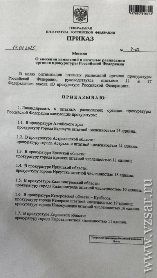 Приказ об упразднении прокуратуры областного центра подписал генеральный прокурор России Игорь Краснов. В документе указано, что это связно с необходимостью «оптимизации штатных расписаний». Об этом сообщают СМИ. Всего, согласно приказу, в России ликвидируют 20 городских прокуратур. Прокуроры соответствующих субъектов должны в течение 10 дней представить приказы о перераспределении высвободившихся сотрудников, разграничить компетенции между нижестоящими прокуратурами, изменить их штат, а также фонд оплаты труда. Фото: ИА «Взгляд-Инфо»