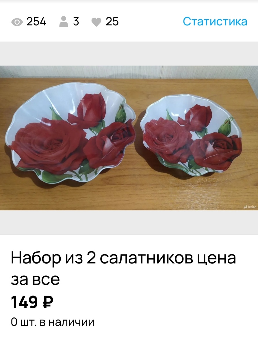 Доброго здоровья читающим. Возвращаюсь. Прошу прощения за долгое отсутствие. Отдохнула ( или поленилась). Но благодаря Вере Александровне и её цитате (спасибо огромное, как я вам благодарна) я проснулась после новогодней спячки. Цитата такая: "Лень убивает амбиции". Читать её надо наоборот, и всё сразу встаёт на свои места. Как важно иметь хороших людей в друзьях! Спасибо всем, на кого подписана, и кто подписан на меня. А теперь о продажах. Продались салатники. Вроде бы обычная продажа, но... Салатников было три, они стеклянные, родом из начала двухтысячных и получены были в подарок. Фрукты в них лежали, помню. Наверное, и салаты. Потом один разбился, и осталось их два. Дальше все прозаично: шкаф, забвение, Авито. Но и на Авито покупать их никто не спешил. Долговисы полуторагодовалые, так можно их назвать. Перед Новым годом снизила цену, очень хотела продать . Но не смогла) Но вдруг, почему-то Авито дал им зелёный свет и просмотры. Смотрите сами: Аттракцион неслыханной щедро