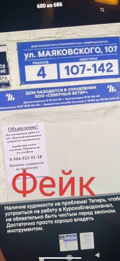 Неизвестные расклеили на стендах управляющих компаний объявления о наборе сотрудников «Курскводоканала» с пометкой: «Наличие судимости не проблема!».
