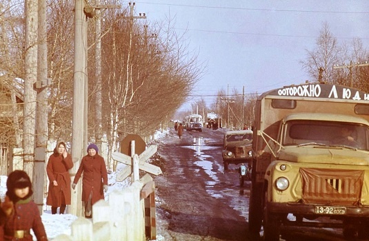 – Улицы в центре Смирных были достаточно широкими, большого движения на них не было. Легковых машин в принципе мало было, в основном всякий служебный автотранспорт да грузовички ГАЗ-51 товары по магазинам развозили. Вот магазинов для небольшого посёлка было относительно много. В Смирных был даже свой ТОРГ, это такая контора, которая снабжала магазины товарами. Это было, наверное, самое уважаемое заведение. Там было много разного дефицита и импорта. Кто там работал или имел там знакомых, были «в полном шоколаде». В принципе, и в магазинах было много разных дефицитов. В продовольственных магазинах, в отличие от магазинов в европейской части Союза, свободно продавалась сгущёнка, тушёнка, гречка и подобное. В промышленных тоже частенько «выбрасывали» дефициты, одежду и обувь, вплоть до японской радиотехники. А японские магнитофонные кассеты можно было купить чуть ли не «запросто». Они часто были в продаже. Вдоль улиц стояли в основном одноэтажные деревянные строения. Здесь были и жилые дома, и магазины, и разные учреждения. Пожалуй, пятиэтажка в нашем авиагородке была самым высотным зданием в Смирных.