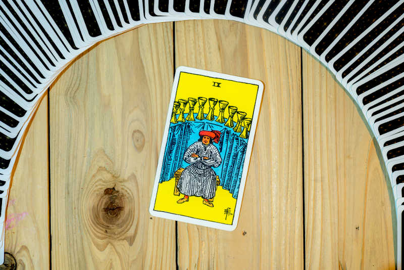 Таро: Девятка кубков — замечательная карта. Её появление в прямом положении дарит облегчение и обещает исполнение желаний. В перевёрнутом виде она становится своей тёмной стороной, предостерегая от ложных иллюзий и предупреждая о том, что полученные блага могут принести разочарование.