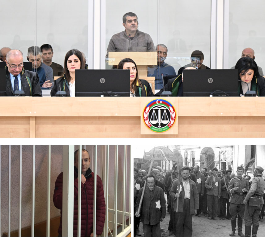 Внизу, под фотографией бывшего президента Арцаха, Араика Арутюняна в зале суда вы видите слева меня там же, в зале суда в 2017 году, а внизу справа фотография 1942 года в Варшавском гетто где евреи с нашивками в виде желтой звезды Давида отправляются на работу и рядом стоят фашисты и смеются. Вы спросите, какое эта трагическая фотография времен Холокоста имеет к суду над армянскими военнопленными в Баку? Я вам объясню.