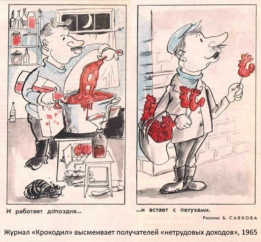Посыл карикатуры понятен: есть «настоящие» труженики, которые работают допоздна и встают с петухами, а есть кустарь-прощелыга, который при помощи забавной игры слов тоже укладывается в эти рамки, хотя доходы у него «нетрудовые».