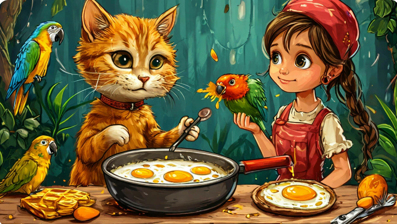 И тут все трое, заливаясь смехом, поняли, что впереди их ждёт ещё много кулинарных приключений и забавных споров. А главное — они всегда будут вместе, подшучивая и поддерживая друг друга. Потому что, как известно, без этого жизнь была бы скучной. А на той кухне, где живут любопытная девочка, ворчливый кот и попугай-повторюшка Кеша, всегда найдётся место для смеха, любви и, конечно, свежей яичницы!