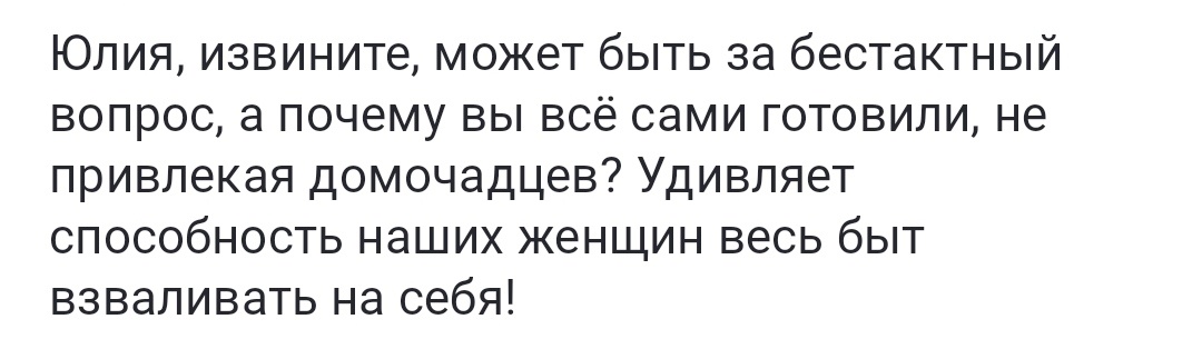 Не регулярными выходят у меня регулярные рубрики😂 Хотя я и стараюсь о них не забывать. Так что сегодня отвечаю на вопросы читателей. Развернуто. Для меня готовка - некое колдовство. Таинство. Ты вкладываешь в результат частичку своей души, эмоции, тепло своих рук. Кстати, к такому же таинству я отношу и уборку - очищение жилья не только от накопившегося мусора и пыли (и шерсти Барсика!😂), но и дурных эмоций, негатива. Уже как-то рассказывала, что раз в месяц откладываю в сторону швабры и робота-пылесоса, развожу соль и ручками намываю полы. Это не тяжкая обязанность, а кусочек магии. А пылесос можно попросить встряхнуть домочадцев. Оттого хоть семейство и стремиться мне помочь, но я на кухне во время приготовления обеда или ужина предпочитаю феячить в одиночестве, включив фоном телевизор, с зажжеными свечами, в покое. Даже на даче отправляю бабушку отдохнуть со словами "Мне не нужно помогать!" и творю одна. И выставляю с кухни папу. Мне так комфортнее, а комфорт кухарки - главная