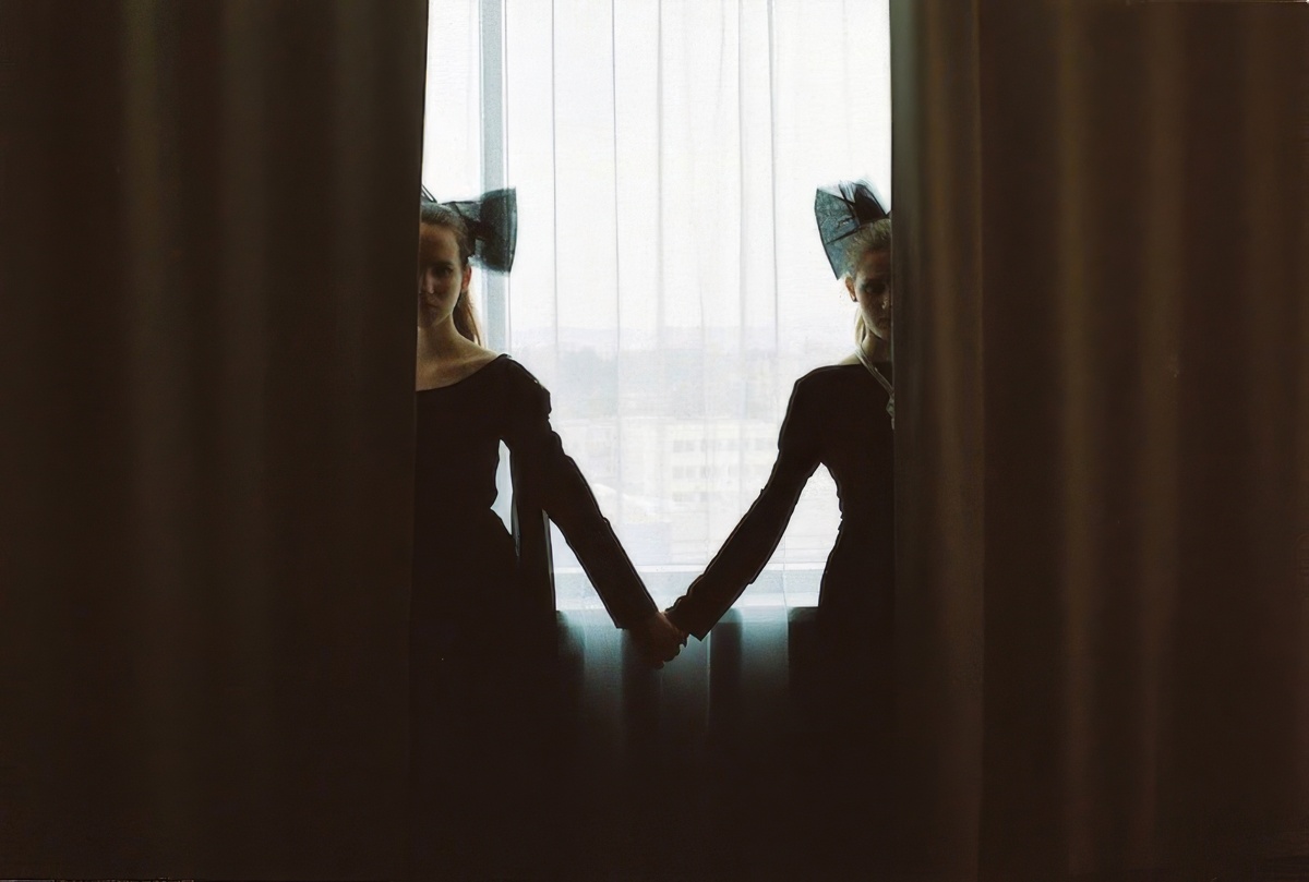 Их выражения лиц словно застыло между наслаждением и механическим выполнением ритуала, движения синхронны, взгляды чуть отрешённые. Это момент, вырванный из потока времени, кадр, в котором за внешней невинностью кроется многослойный подтекст.