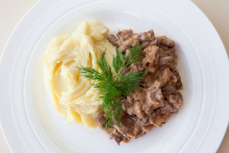 Кулинарный канал «Экономная Вкуснятина» Ингредиенты: 1. Мясо нарезаем тонкими пластами. Накрываем куском пищевой пленки и хорошенько отбиваем молоточком. Затем нарезаем на тоненькие кусочки (соломкой). Тут чем лучше отобъем и мельче нарежем, тем бефстроганов получится нежнее. Солим и перчим мясо. 2. Отмеряем сметану, томатную пасту и муку. Мелко нарезаем лук. 3. Обжариваем до золотистого цвета лук и добавляем к нему нарезанное мясо. Обжариваем на средне-сильном огне, постоянно помешивая лопаткой, пока мясо не перестанет быть розовым, минут 5-10. 4. Добавляем муку, хорошенько перемешиваем, обжариваем пару минут. 5. Добавляем сметану, перемешиваем, протушиваем 2-3 минуты. 6. Заправляем томатной пастой, солим-перчим по вкусу и все, готово! 7. На гарнир картофельное пюре. Приятного аппетита!