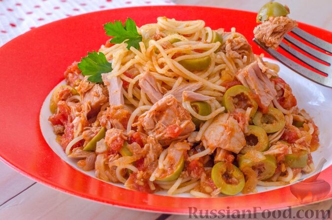 Паста в томатном соусе с тунцом и оливками. Паста с курицей и сыром в томатном соусе. Макароны с грудинкой и зелёным горошком. Макароны с мясным фаршем, грибами и копчёностями. Паста с курицей и сыром в томатном соусе. Запанированные кусочки куриного филе сначала обжариваются, а потом тушатся с овощами и томатным соком. Затем соединяются с моцареллой и отварными макаронами. В конце паста дополняется пармезаном. Макароны с грудинкой и зелёным горошком. Грудинка, обжаренная с чесноком, придаёт блюду невероятно аппетитный аромат. Замороженный зелёный горошек отваривается пару минут и сохраняет свою яркость. При подаче блюдо дополняется мягким сыром и зеленью. Макароны с мясным фаршем, грибами и копченостями – сытное блюдо с богатым вкусом и красочным видом. Шампиньоны обжариваются с луком и чесноком, дополняются ветчиной, копчёной грудинкой, помидорами и зеленью. Фарш отдельно обжаривается на сливочном масле. Затем всё перемешивается с отварными макаронами. Макароны с тыквенно-сливочным