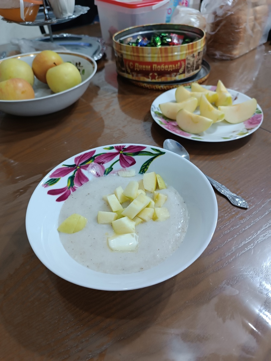 Иду поднимать своё сонное царство. На удивление легко сегодня встали и Андрей, и Вера. Пока они совершали водные процедуры, я уже как пчёлка кружила по кухне, составляя на стол тарелки для завтрака. Сегодня доедаем ячневую кашу. Для лучшего пищеварения добавила в привычный завтрак яблоки, себе этот источник витаминов положила прямо в кашу (для разнообразия). Остальные выложила на тарелку. Как я, домочадцы мои есть не будут)