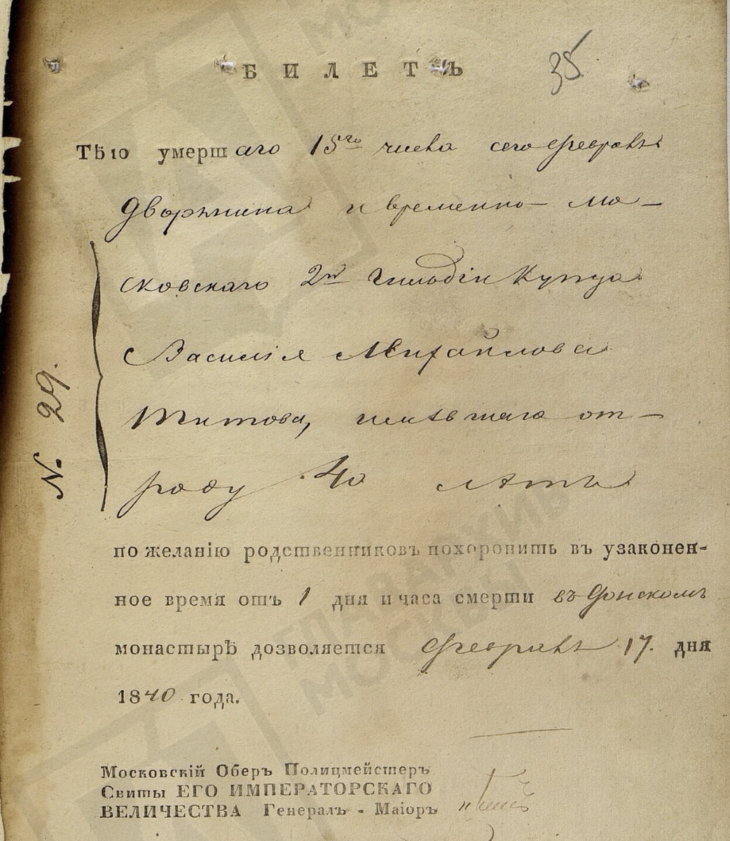 В Центральном Государственном архиве Москвы (cgamos.ru) есть фонд 421. В нем хранятся документы, связанные с кладбищем Донского монастыря. Среди прочего - билеты на разрешение хоронить умерших на кладбище. В этих билетах можно найти дополнительную информацию о тех, кто захоронен. Например, чем занимался усопший или иногда упоминается в какой церкви его отпевали. Часто этой информации нет в обычных источниках. Я просмотрела 1840 и 1863 годы и выбрала тех, о ком уже были посты (ссылки на них будут в конце). Василий Михайлович Титов (1799-1840) "БИЛЕТ Тело умершаго 15го числа сего февраля дворянина и временно-московскаго 2й гильдии купца Василия Михайловича Титова, имевшаго от роду 40 лет по желанию родственников похоронить в узаконенное время от 1 дня и часа смерти в Донском монастыре дозволяется февраля 17 дня 1840 года. Московский Обер Полицмейстер Свитя ЕГО ИМПЕРАТОРСКАГО ВЕЛИЧЕСТВА Генерал-Майор ..." Андрей Егорович Фаминцын (1764-1840) "БИЛЕТ Тело умершего 21го сего Августа Действи