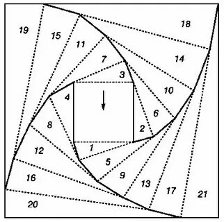 В теории так: описываем предыдущий квадрат квадратом большего размера, смещая угол квадрата на 1/4 часть длины стороны нового большого квадрата.